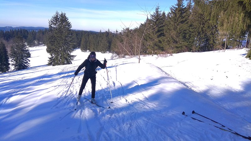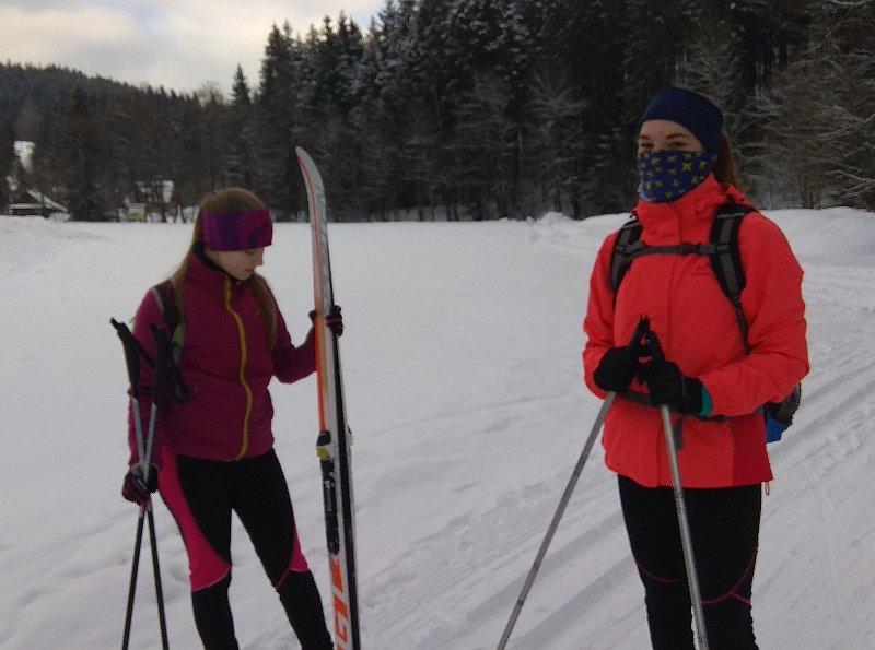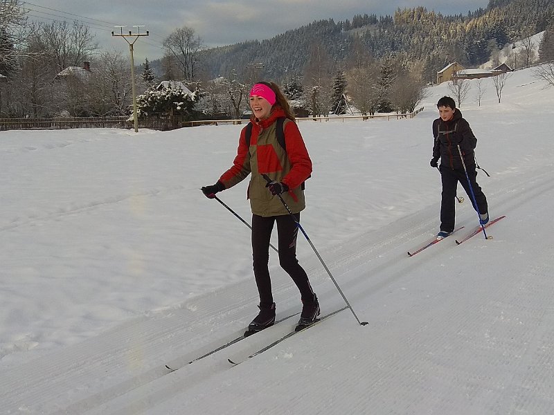 První den jsme techniku běhu a plužení ve sjezdu trénovali v těsné blízkosti školy na čerstvě napadlém sněhu. V úterý jsme pak již vyrazili do Velkých Karlovic na "okruhy", které jsou pro začátečníky ideální. Ve středu jsme přidali první kopečky opět v Karlovicích a závěrečný den výcviku jsme si troufli na část klasické běžkařské hřebenové trasy Soláň - Třeštík.