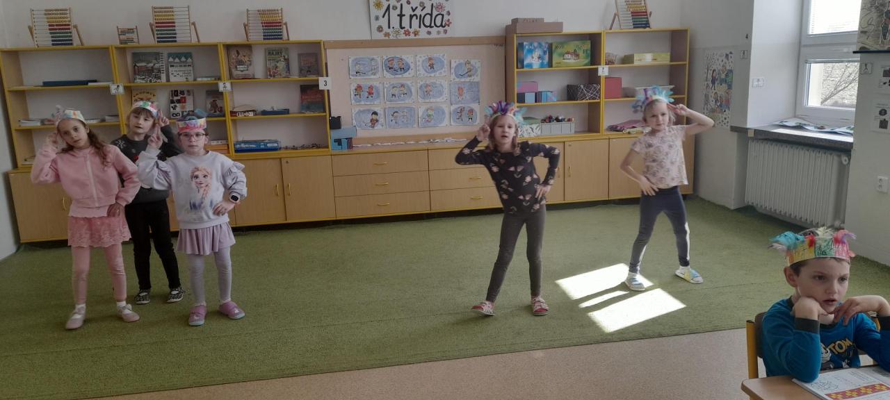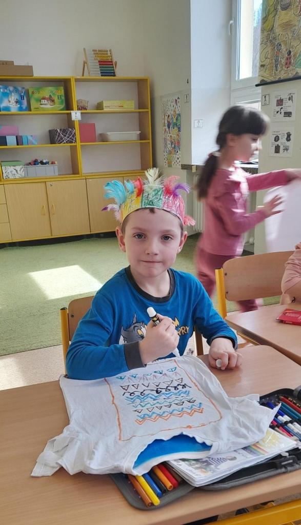 Poslední týden před jarními prázdninami jsme si zpestřili indiánskými počty. Spočítali jsme kolik per má Indiánka na čelence, kolik totemů je v indiánské vesnici, kolik šípů vystřelil Indián, aby ulovil bizona. Aby se nám vše podařilo, stali se i z nás Indiáni. Vyrobili jsme si indiánské čelenky a indiánská trička, namalovali totemy, zkoušeli trefit terč a také si zatancovali indiánský tanec. Indiánský týden se povedl.