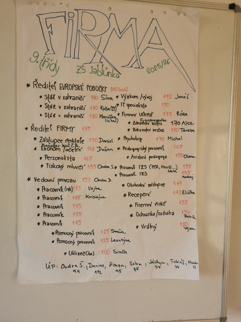 Po uplynutí časového limitu se sečetly body a ti, kdo nasbírali nejvíce, si vybírali nejatraktivnější pozice ve firmě. Ti, kdo nenasbírali dostatečný počet bodů, se do firmy vůbec nedostali. Většina žáků však byla velmi aktivní a podařilo se jim získat pozice ve firmě, které chtěli.